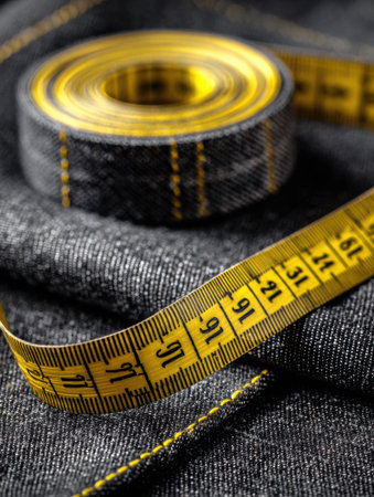 A yellow measuring tape is coiled on dark denim fabric, showing clear markings for accurate measurements in crafting and tailoring.