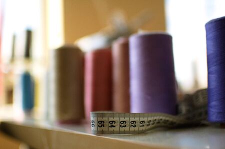 Thread spool and tape measure with sewing tools at table. Concept of clothes atelier workplace