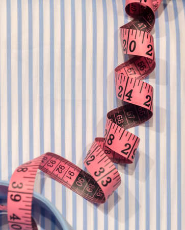 Pink Curly Tailor's Tape Measure on Striped Cloth