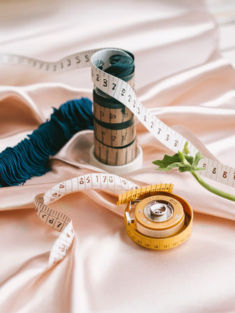 Seamstress meter for measuring the length and volume of the model. The measuring tape lies on a wooden board. On the table is a yellow sewing meter.