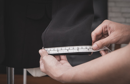 The tailor's hands measure the length of a piece of fabric with a centimeter. tailoring. Sewing