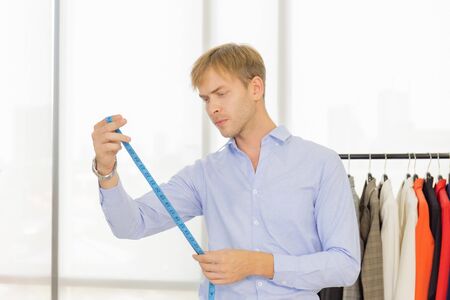 Seamstress measuring the length of cloth tape measure on a white background. Copyspace.