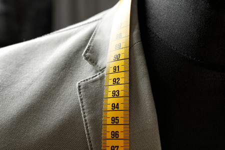 suit jacket on male tailor mannequin and tape measure, creative concept of clothes atelier