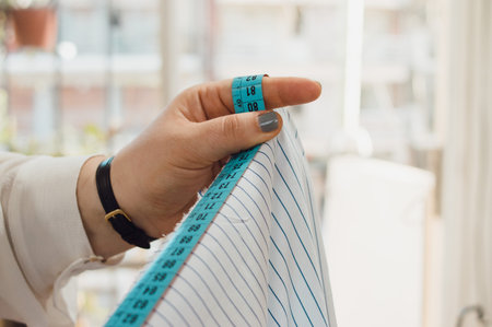 hands of unrecognizable woman measuring a fabric with a tape, working inside her sewing workshop, clothing concept, copy space.