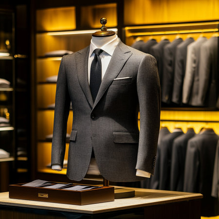 Stunning display of a tailored men's suit showcasing elegance and style in a refined setting. Perfect for fashion enthusiasts and professionals alike.