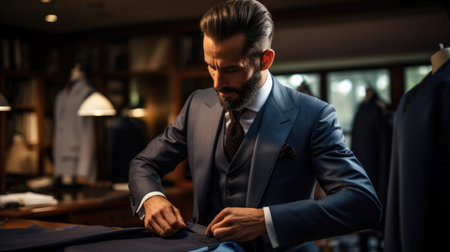Portrait of a confident businessman wearing an elegant suit in a tailor shop, showcasing confidence and style