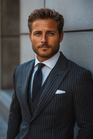 Man in a sharp, pinstriped suit, posing confidently against a sleek, modern wall