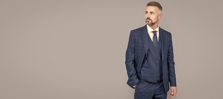 mature ambitious man businessman in businesslike suit has grizzled hair, business success. Man face portrait, banner with copy space.