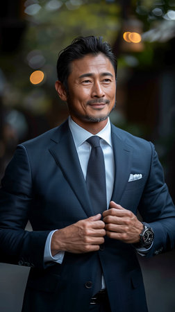 Japanese middle-aged man in a suit and tie smiling while checking his watch, surrounded by green trees