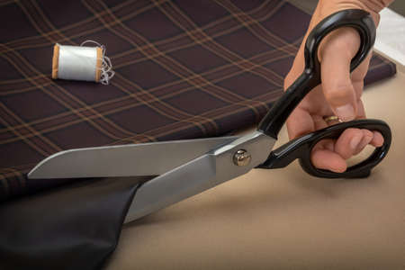 Tailor's scissors in a woman's hand cut the fabric. close-up