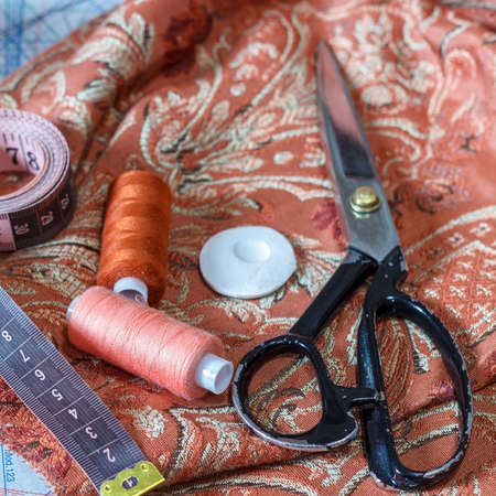 Old retro tailor's tools for sewing clothes. Centimeter, scissors, thimble and needle with snitch.Old retro tailor's tools for sewing clothes. Centimeter, scissors, thimble and needle with snitch.