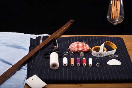 Thread spool and tape measure with sewing tools at table. Concept of clothes atelier workplace