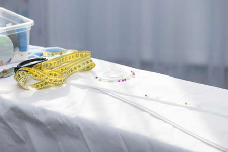 Tailoring, sewing tools, accessories on white cloth. Copy space. Consept stay at home, work at home.