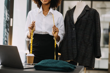 Fashion Designer hand is measuring jacket with measuring tape