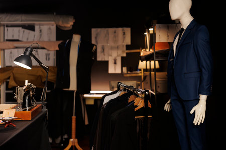Upscale professional tailoring studio full of premium quality bespoken sartorial clothing on mannequins fashion design sketch drawings on walls. Atelier shop with stylish elegant fashion collection