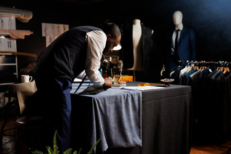 Meticulous suitmaker focused on perfecting client comissioned exquisite suit blazer for upcoming wedding. Couturer working on bespoke sartorial attire in professional tailoring shop