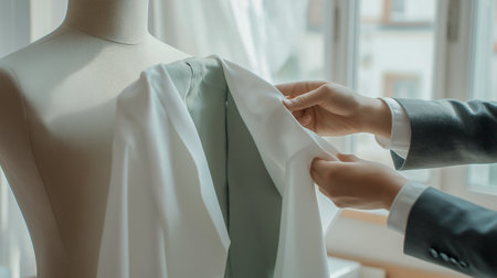 When sewing women's clothes, a creative fashion designer holds pieces of white delicate fabric for a mannequin.