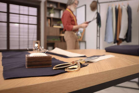 Sewing tools and accessories on a table in a tailor shop