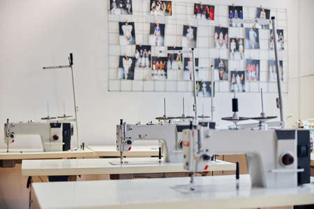 Table with sewing machine stands in row in light production workshop