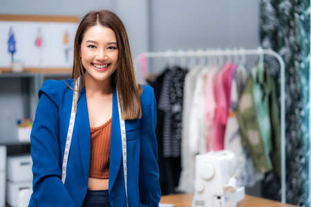 Clothes shop, Asian fashion designer working in her showroom studio, Dressmaker matching the best color for customer, Business start up and small business owner concept.