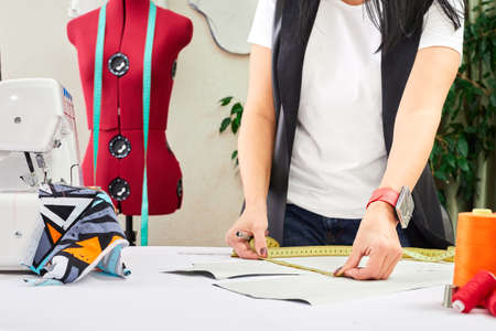 Female designer working with measure tape and sketches. Fashion tailor or sewer in a workshop designing new clothes collection. Woman marking fabric in dressmaking salon.