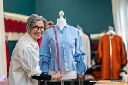 Woman touching shoulder of mannequin in blouse with measure