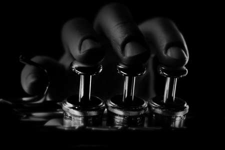 trumpet valves close up in black and white