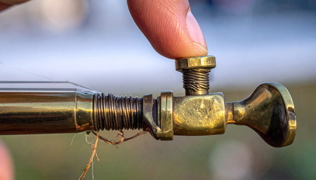 A close-up shot captures the delicate act of fine-tuning a vintage brass mechanism. A finger carefully adjusts a small screw, highlighting concepts of precision, control, and detailed craftsmanship.