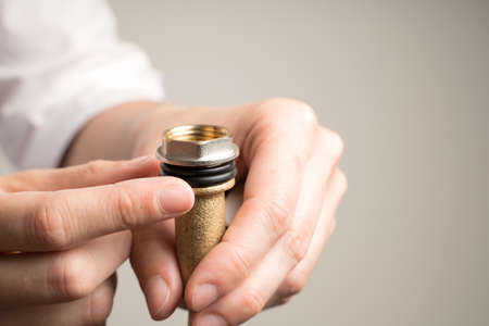 Hands fasten the nut to the valve tap. Concept of repair work.
