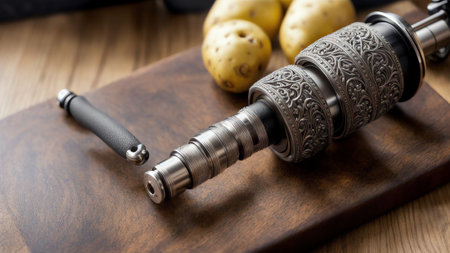 Stainless Steel Potato Peeler on Wooden Cutting Board. AI Generated.