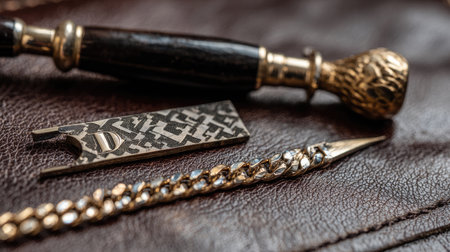 Close-up view of exquisite writing instruments and decorative elements resting on a rich leather surface, showcasing elegance and craftsmanship in design.
