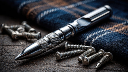 A sleek silver pen lies on a wooden surface, accompanied by metal screws and textured textile fabric. This composition captures elements of craftsmanship and creativity.