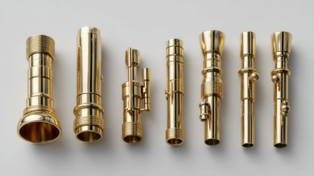 A row of gold colored metal tubes. The tubes are of different sizes and shapes. The tubes are arranged in a row, with the largest tube on the left and the smallest tube on the right