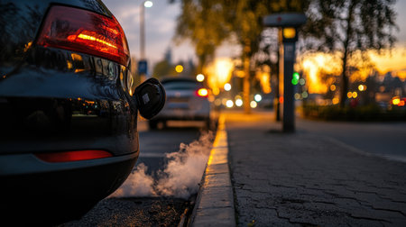 A car emitting exhaust fumes at sunset, highlighting pollution
