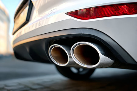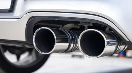 This close-up image showcases dual chrome exhaust tips of a sporty car, highlighting the sleek design and shine amidst a modern automotive environment.