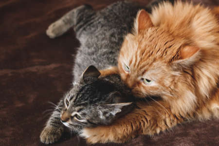 Big ginger cat hugs his beloved cat
