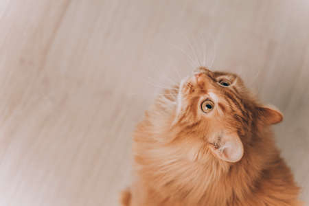 Close-up red cat with green eyes looking on camera. Cute aborable red cat asks food.
