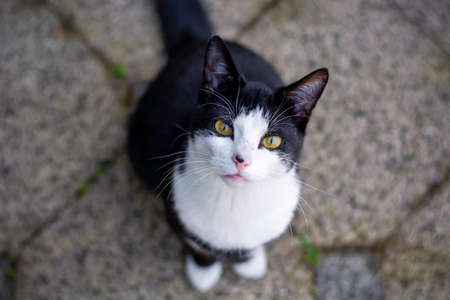 Black and white cat with yellow eyes sitting outside on the ground and looking up staring at the camera