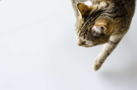 Cat walking on a white table