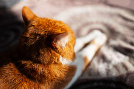 Portrait of cute red and white cat from the back, lying on the bed.