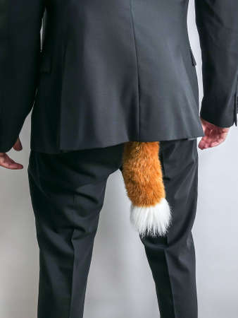 Sneaky businessman in black suit with a fox tail. Concept for economic / white collar crime, fraud and black market. White background.