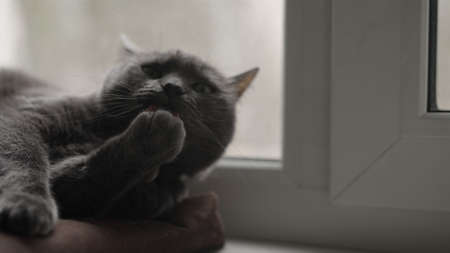 Gray cat cleaning himself on a windowsill