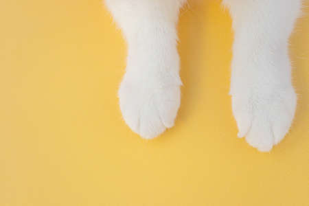 White cat paws on a yellow background. Top view, copyspace. The concept of pets, cat care, veterinary medicine, zoo.