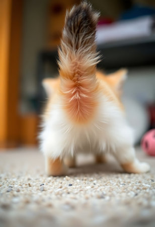 A close-up shot of a fluffy tabby cat's tail, backlit by warm sunlight in a cozy indoor setting. The soft fur and distinct striped pattern are in sharp focus, creating a peaceful and domestic scene.