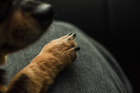 Caring for dogs and being attached to them. Dog paw on human knee