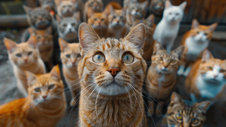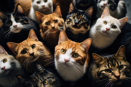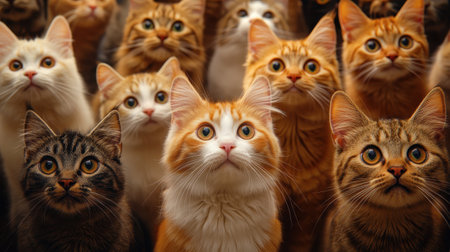 A gathering of cats attentively observing their surroundings, showcasing various fur patterns and colors. The warm lighting highlights their curious expressions and creates a cozy atmosphere.