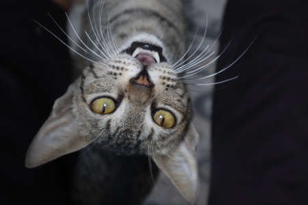 A closeup shot of a domestic cat with a surprised facial expression on a blurred background