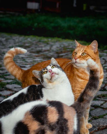 Three stray cats begging for food, close photo of few cats eating dry cat food