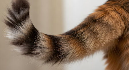 A detailed close-up of a cat's fluffy tail, showcasing the soft, dense fur with a beautiful pattern of brown, black, and white colors. The focus on the texture and natural striping of the tail creates a warm and cozy image.