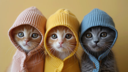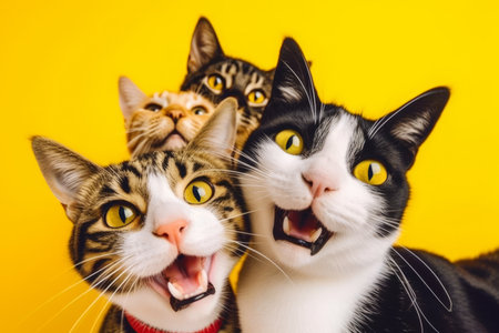 Group of cats standing next to each other in front of yellow background. Generative AI.